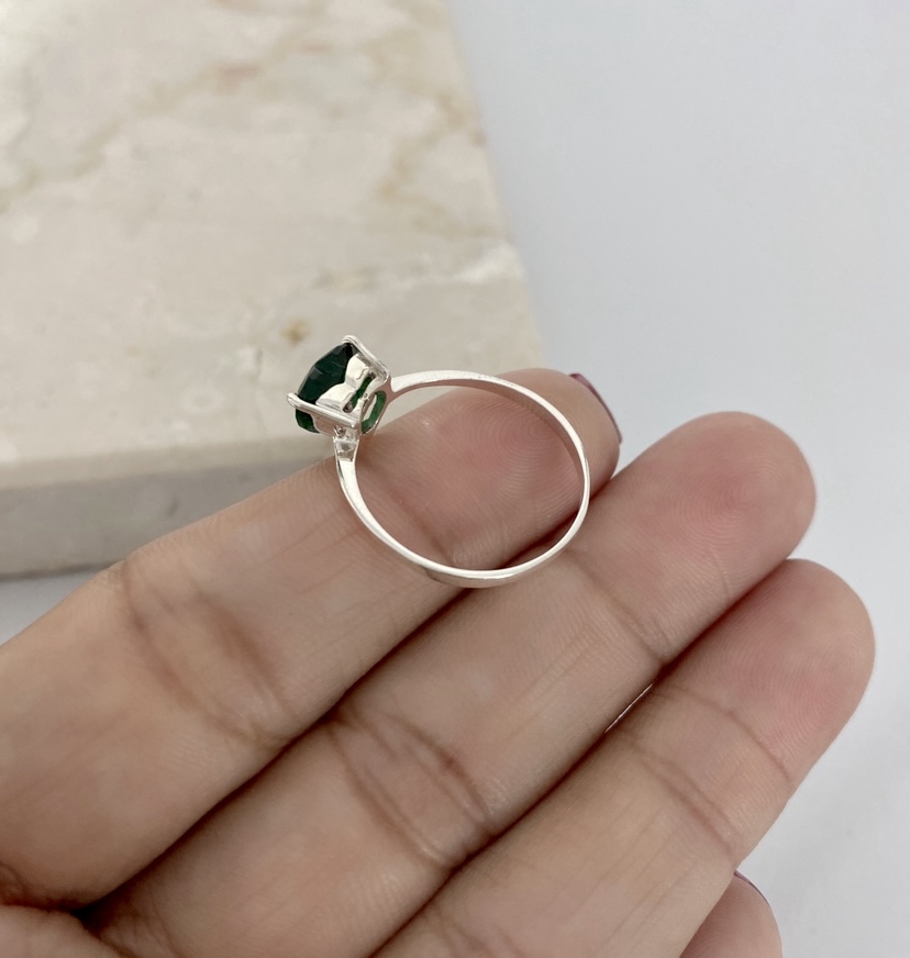 “Descubra a beleza atemporal do nosso anel solitário em forma de coração, com uma deslumbrante zircônia esmeralda verde. Adoce seu estilo com elegância.”